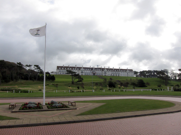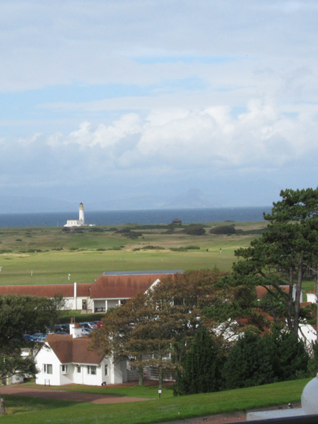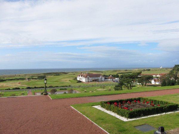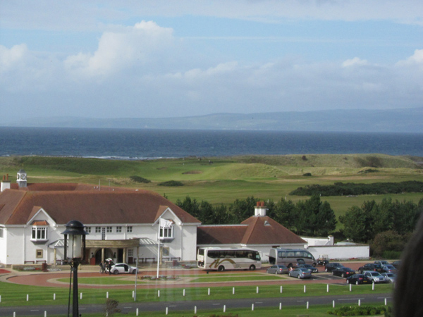 The Turnberry Clubhouse with the links golf course and the Firth of Clyde.