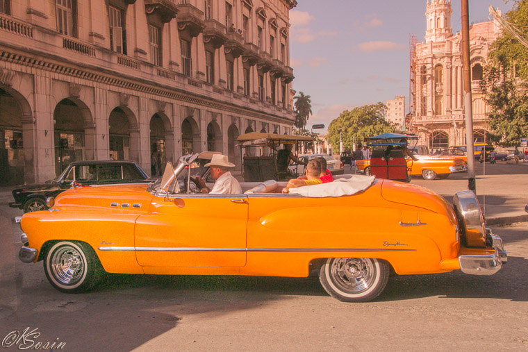 Havana, Cuba, 2014: Oh my, a gold colored car! Buick with continental kit?