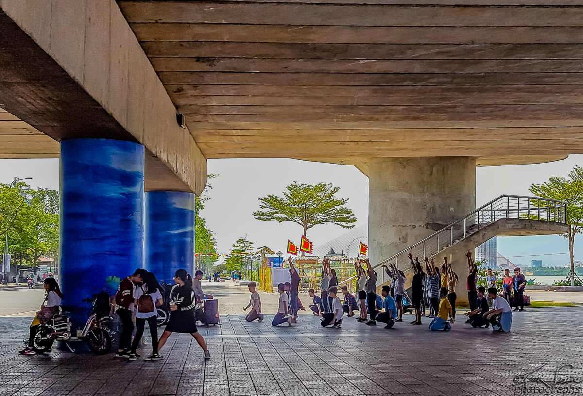 Under the dragon, young Vietnamese in exercise routines.