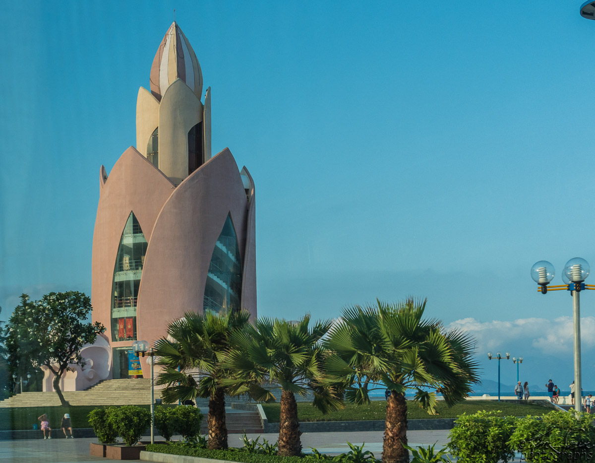 Nha Trang has a long wonderful beach front. This is Tram Huong Tower (aka Lotus Tower), a major landmark along the beach. Lovely area!