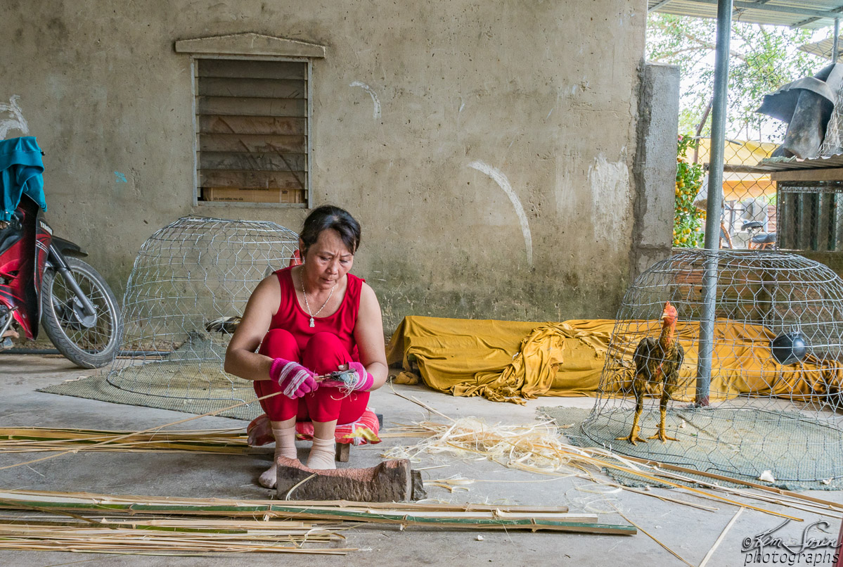 Early stages of the basket - preparing the bamboo. The rooster apparently has been fighting!