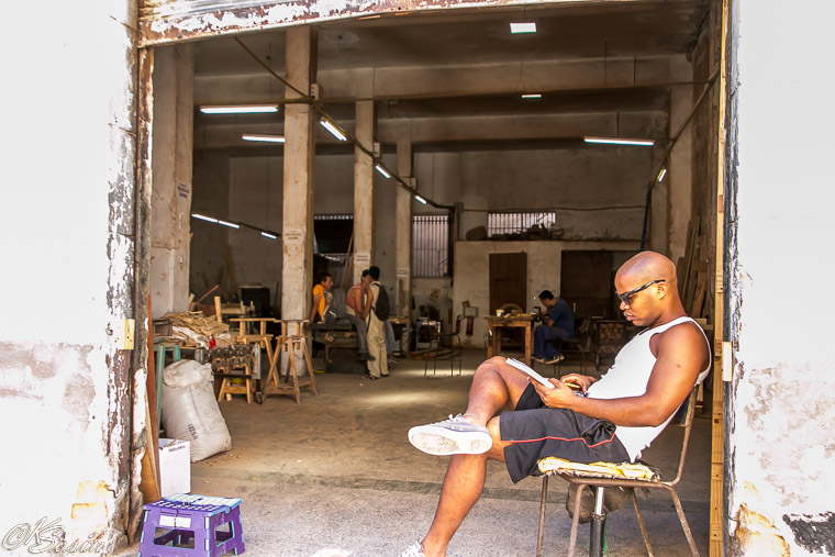 Havana, Cuba, 2014: A peek behind the street, a carpenter's shop.