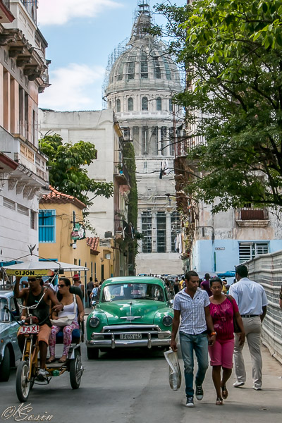 Havana, Cuba, 2014: Narrow street with Capitolio in the background.
