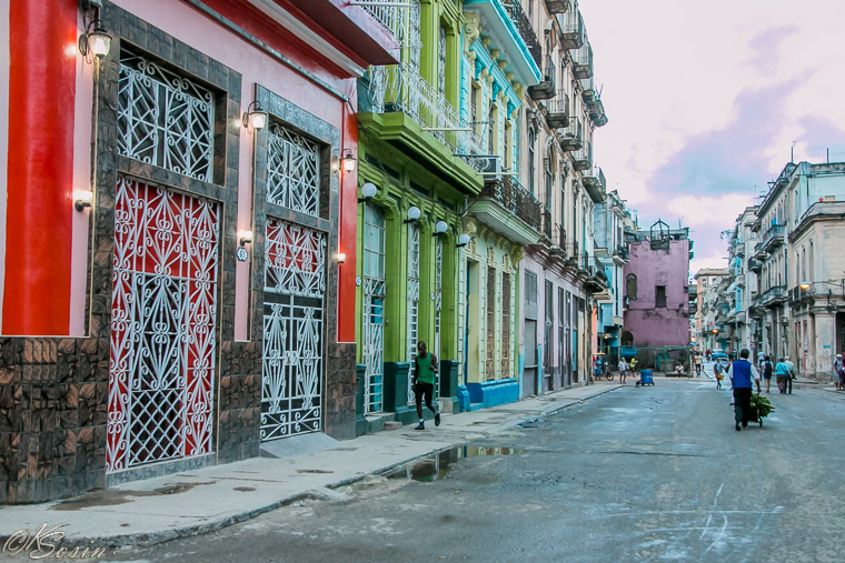 Havana, Cuba, 2014: Colorful restored street of houses and stores.