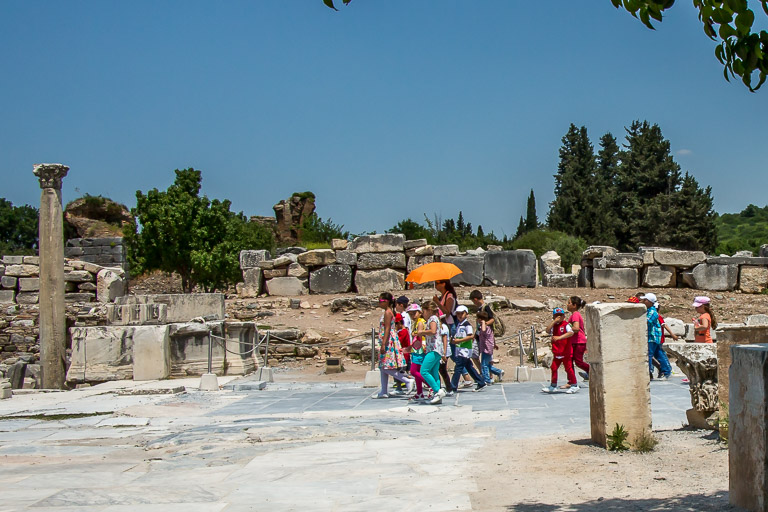School children explore the Ephesus ruins.