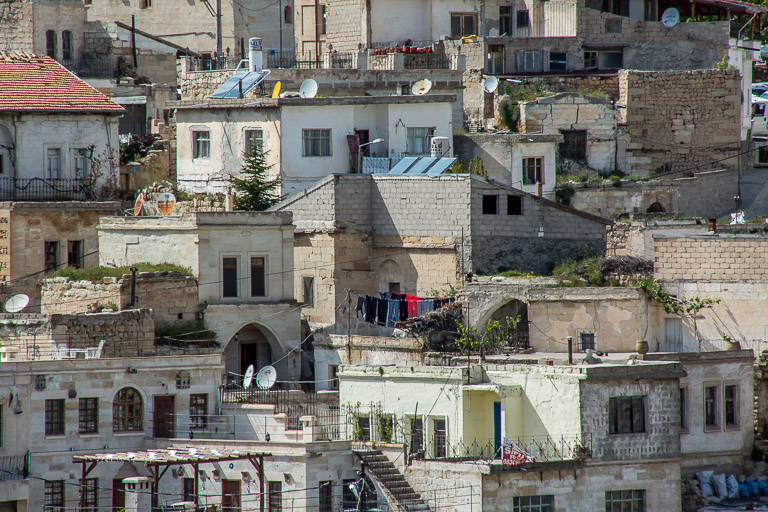 Closer view of hillside houses, rooftops, satellite dishes, gardens.