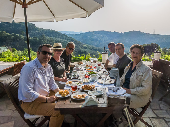 Our entire group, including driver and guide: Breakfast at the hilltop hotel.