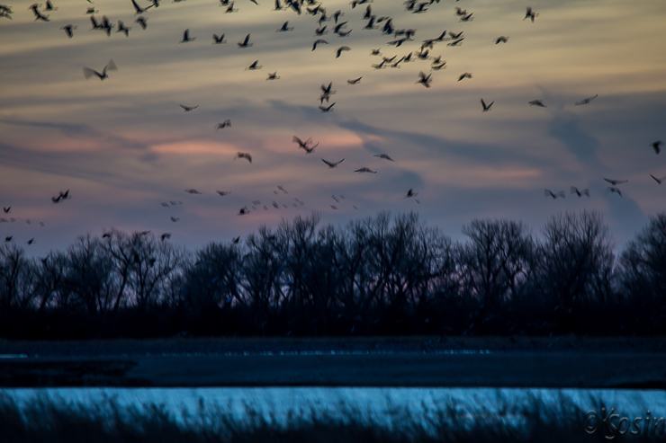 The sunset changes each minute, while still the cranes come.