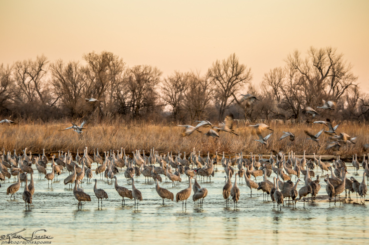The sun is coming up, and the cranes begin to leave to find feeding spots for the day.