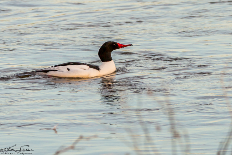 Swimming right in front of us, a common merganser duck. Handsome guy