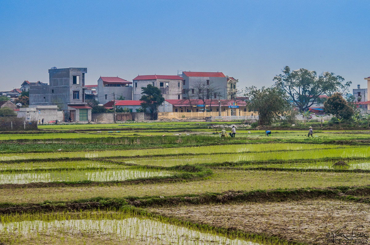 Workers in the rice paddies. Some nice structures in the background.