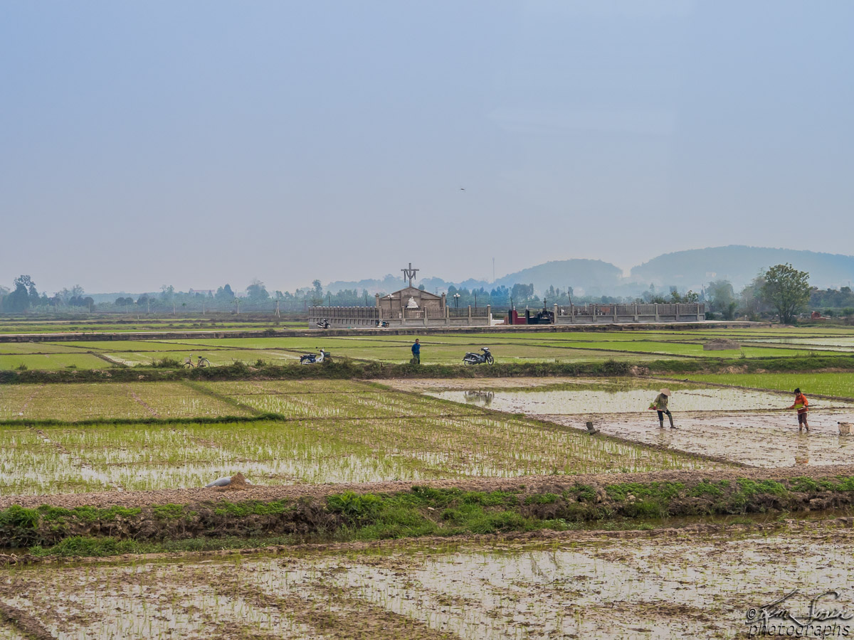 Planting rice. Notice the cemetery in the rice paddie - we saw many cases of graves in the middle of a rice paddy.