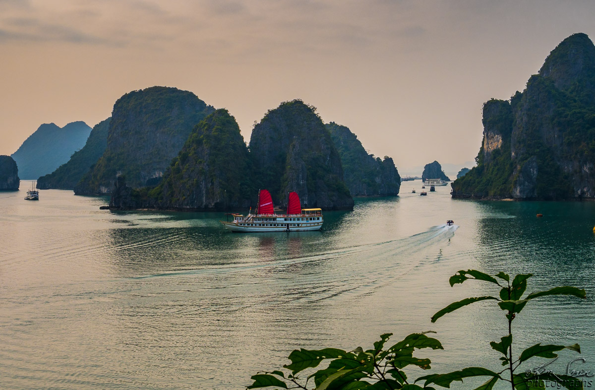 View of a ship with (fake) red sails from the Sung Sot Cave entrance.