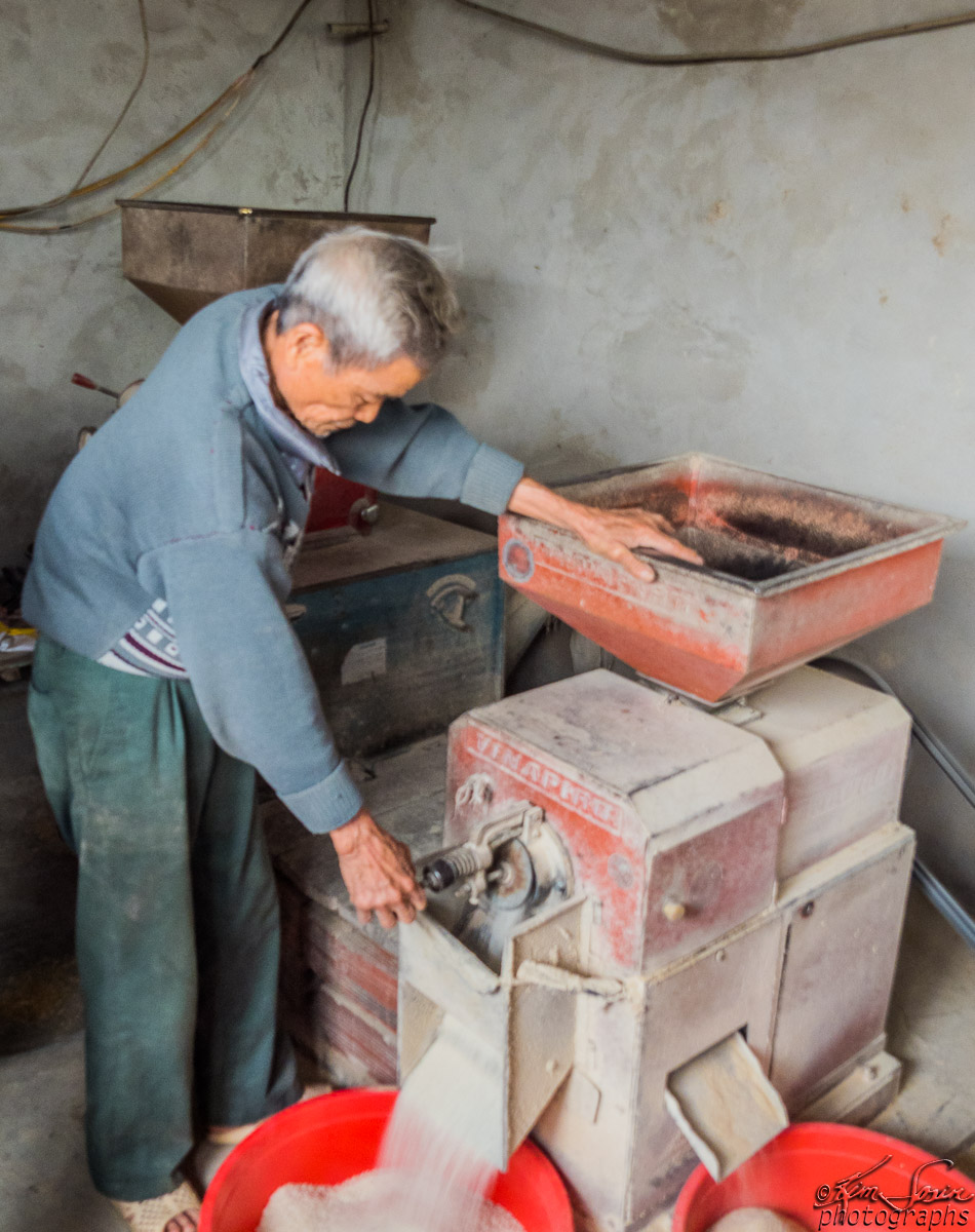 On the way to Hue, we stop at a village and meet a man who hulls rice in a hand machine.