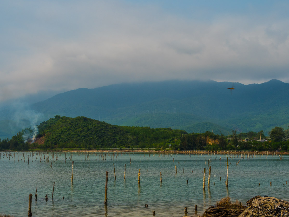 The oyster fishing area. The bike tires in the lower right are used over the sticks (I think) as the oysters fasten onto them.