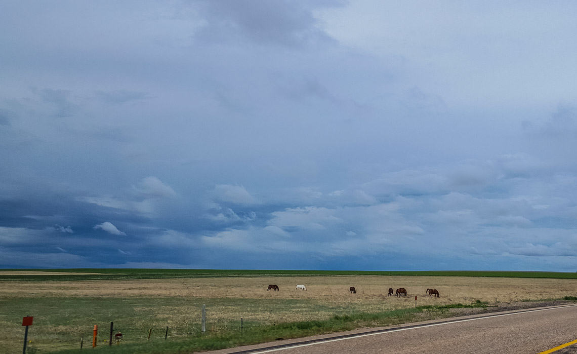 A few horses dot the plains.