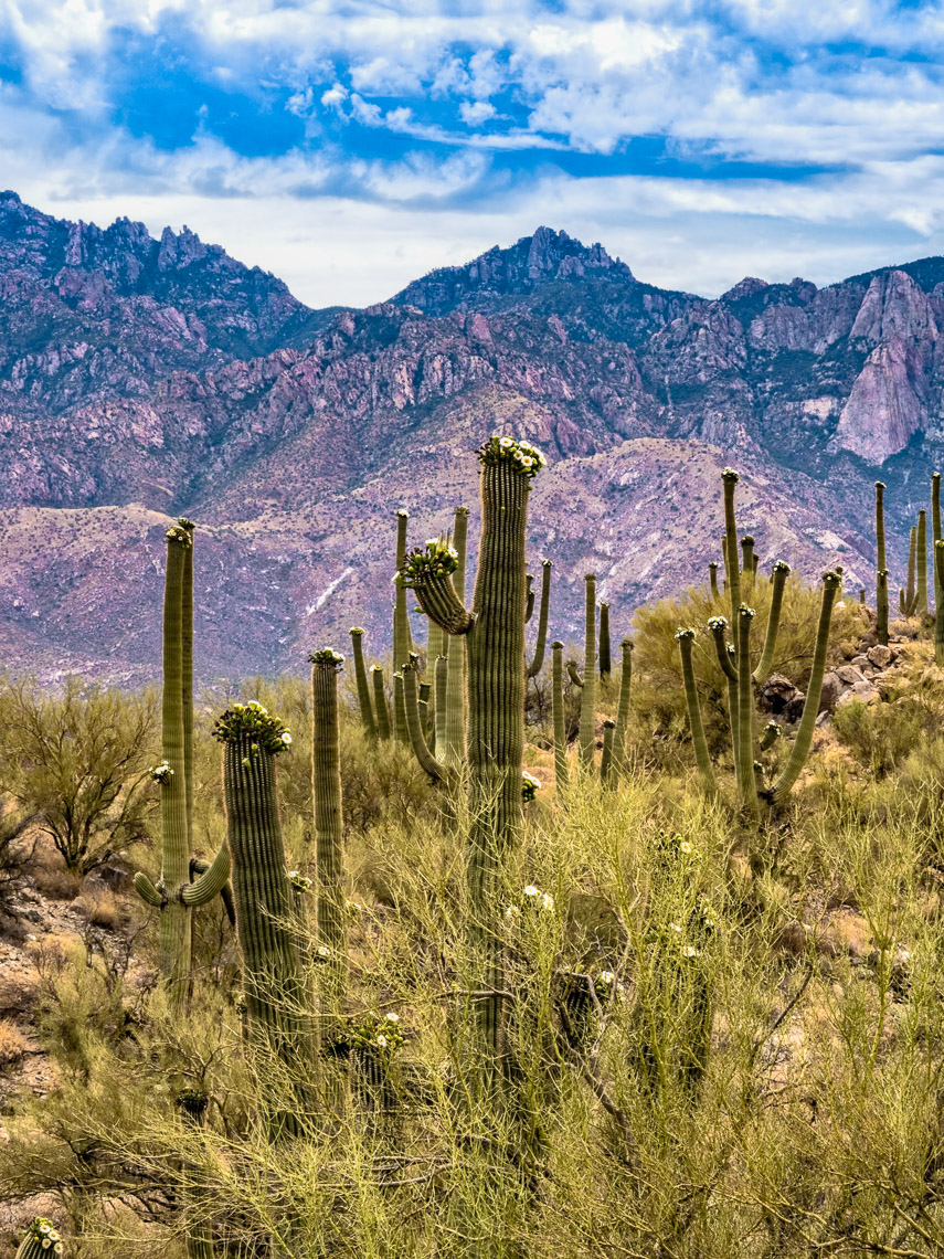 Field of blossoming saguaro near Honey Bee Canyon - Catalina Mountains in the background.