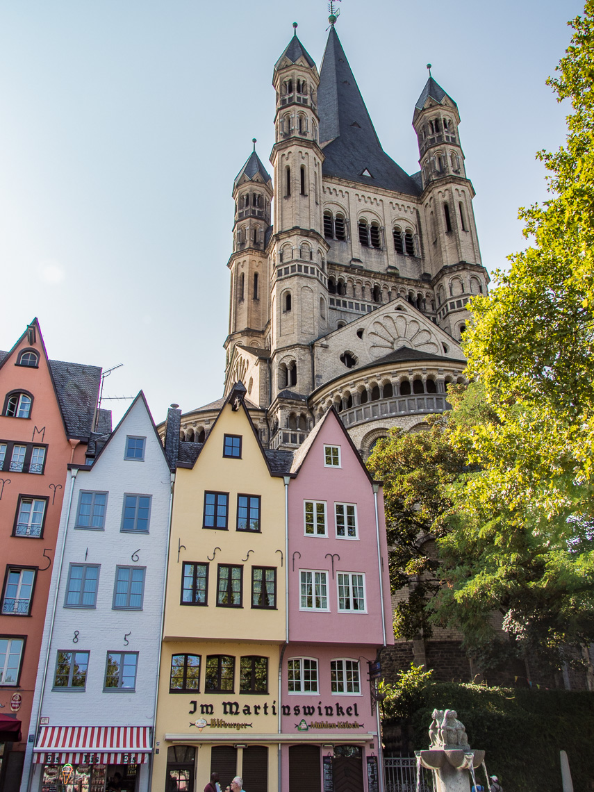 We are in Cologne now. In the background is the Great Saint Martin Church, Romanesque Catholic. Its foundations is on remnants of a Roman chapel, then on an island in the Rhine.