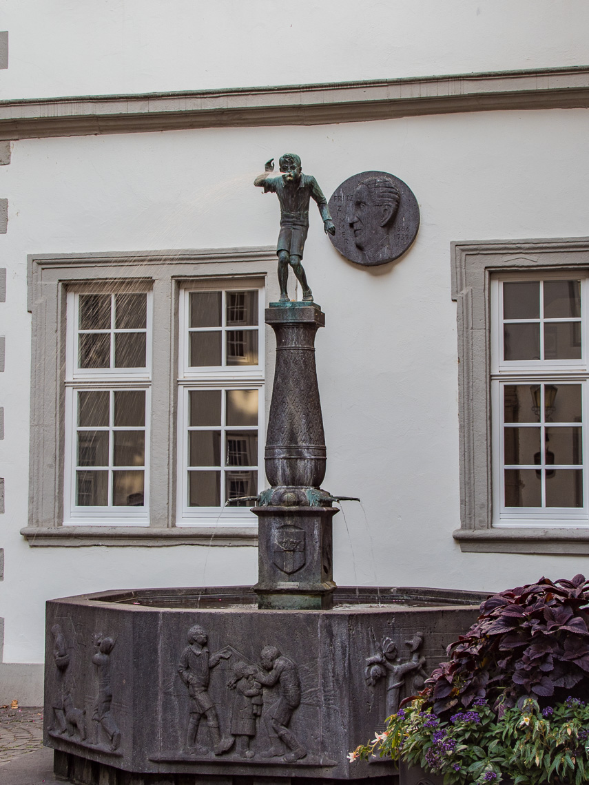 Statue in memory of the spitting boy, a prankster who at random intervals spits on unsuspecting visitors. You can see him spitting in the photo.