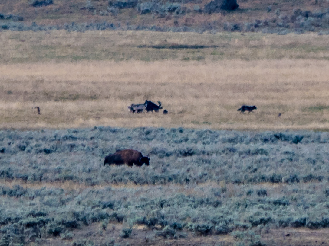 Wolves have something to eat here, as a bison passes by. My 300mm (5/4s lens equivalent to 600mm) barely catches it all.