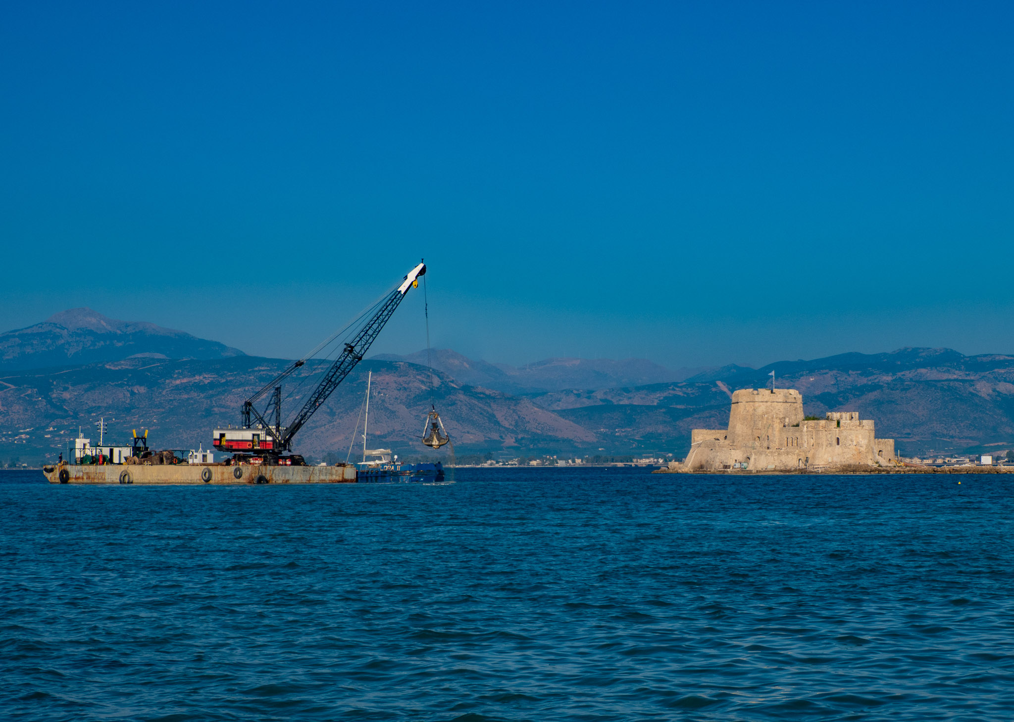 The second huge crane claws mud and silt from the bottom. The Bourtzi Island Fortrress watches silently.