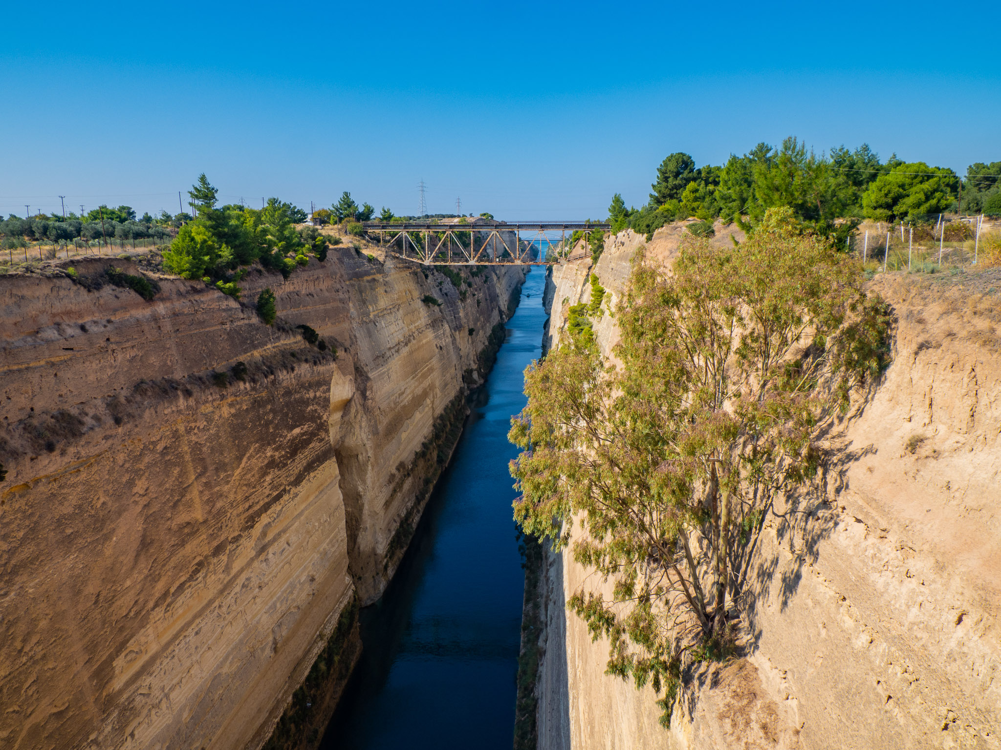 The Corinth Canal connects the Gulf of Corinth with the Saronic Gulf in the Aegean Sea through the narrow Isthmus of Corinth. We are looking towards the Saranic Gulf. The canal separates the Peloponnese from the Greek mainland.